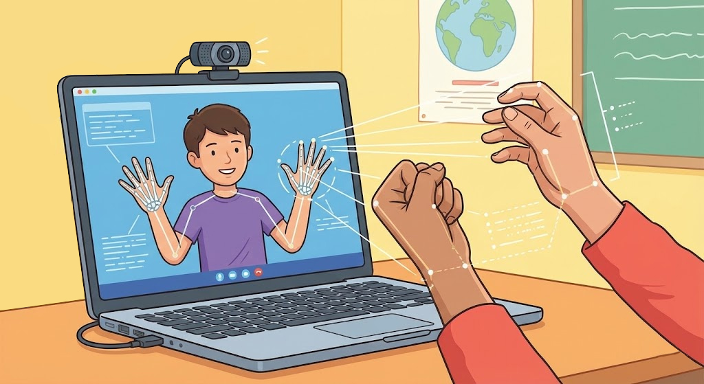 핸드트레킹은 웹캠이 학생의 손동작을 인식하고, 이를 블록 코딩과 연동하여 화면 속 캐릭터나 오브젝트를 제어하는 인터랙티브 코딩 체험 교육입니다.